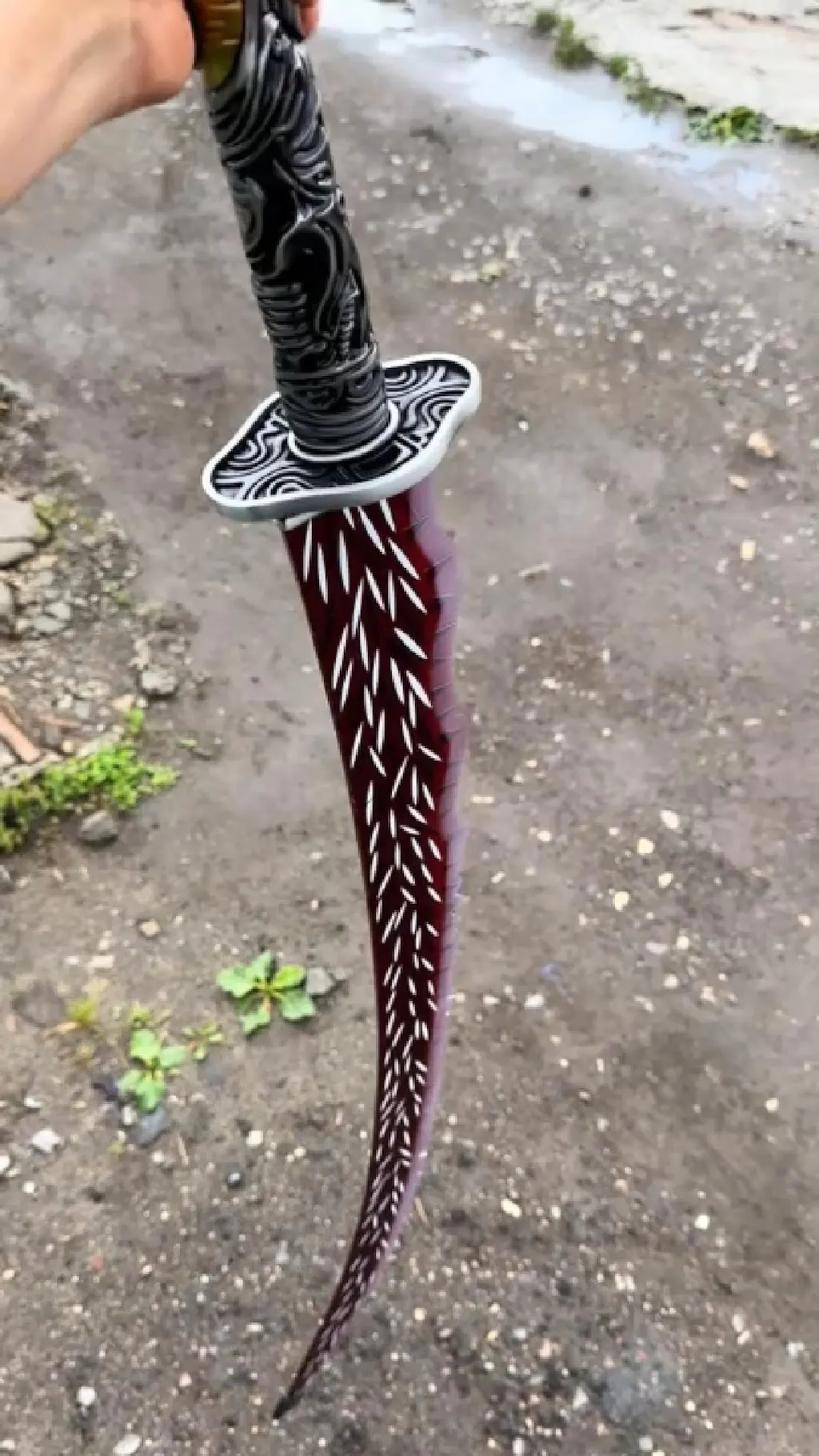 Our smiths have painstakingly translated the weapon's "primitive beauty" into reality using modern metallurgy. The blade, forged from high-grade Stainless Steel, features a specialized finish that mimics the rough, serrated texture of dragon scales, capturing the jagged aesthetic without compromising structural integrity. The hilt is constructed from High-Strength Aluminum Alloy, offering a sturdy, battle-ready feel that grounds the fantasy in your hands.