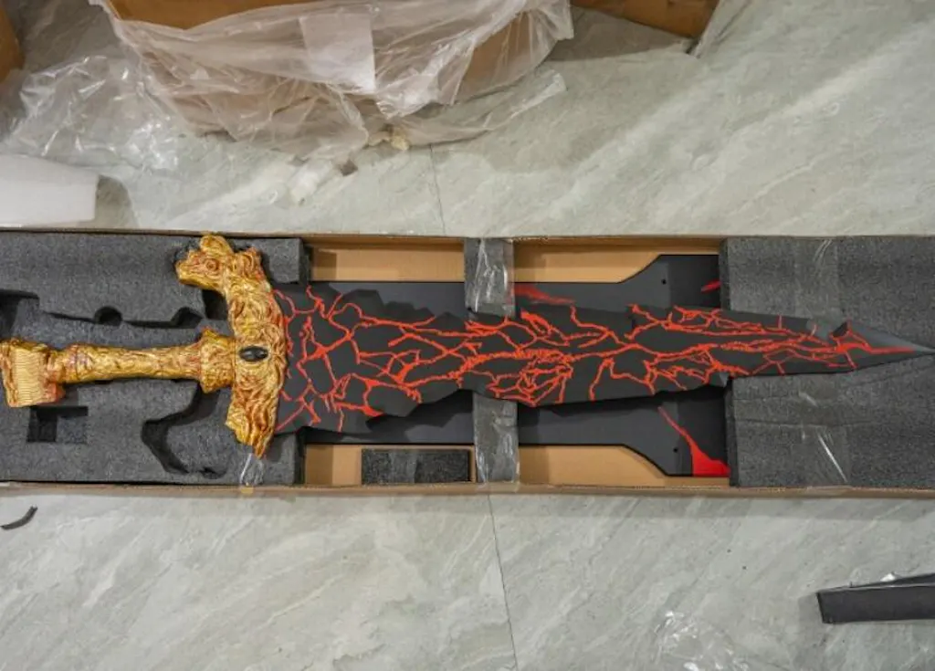 The Blade: Forged from high-quality stainless steel, the 32.67 inch (83 cm) blade features the iconic charred, cracked texture with deep red accents, simulating the dark, fiery power sealed within.